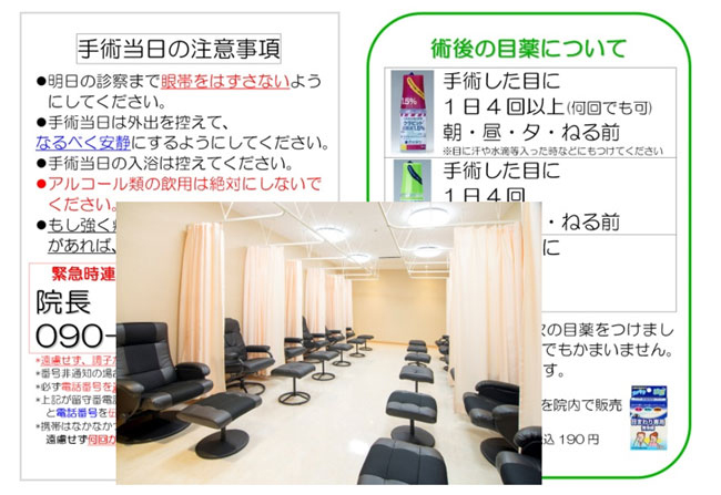 手術前にはえのき眼科本院の2階大ホールにて、インフォームドコンセントをスライドやビデオを用いて理事長が行います。そのあと看護師からの説明もあります。安心して手術をお受け頂けるよう、白内障や眼内レンズや安静度表や注意事項や緊急連絡先(ホットライン)などの各種パンフレットを準備しております。手術はご心配であると思いますので、心のケアもできるように心掛けております。全身疾患には3階の内科のサポートをして頂いております。