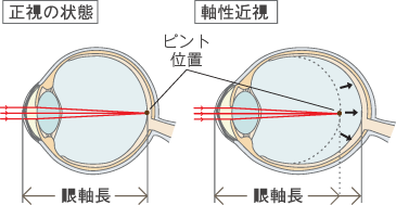 近視は網膜より前にピントが合ってしまう状況です。屈折性と軸性といわれるものがあります。屈折性は角膜・水晶体の光を屈折させる力が強く網膜の前でピントが合うもので、白内障で近視化するのはこれです。軸性は眼球自体が縦長になってピントが合う位置が網膜まで届かないもので、育ち盛りのころに進行するのはこれです。赤ちゃんは誰でも眼球が小さく遠視ですが成長に伴って眼球が大きくなり、正視や近視の方向に進みます。一度眼軸長が伸びてしまうと戻ることがありません。そのために眼軸長の伸びを抑えることが、近視の進行を抑制するためには重要となります。 低濃度アトロピン(マイオピン)には眼軸長を伸展させる働きに関連するムスカリン受容体をブロックする効能があると言われています。
