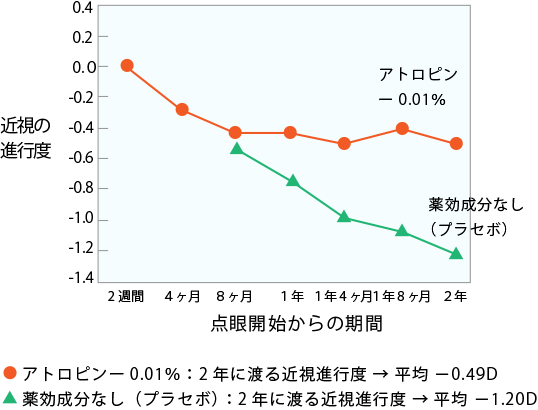 当院では、低濃度アトロピン点眼を1日1回点眼することによって近視の進行を抑制する治療を行っております。低濃度(0.01%)アトロピン(マイオピン)はシンガポール国立眼科センターの臨床試験での近視抑制効果が証明されました。近視の進行が完全に止まるわけではありませんが、少なくとも2年間継続して使用することで、何もしない方と比べ近視の進行を軽減するデータもあります。