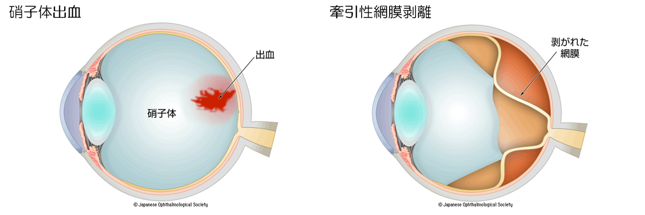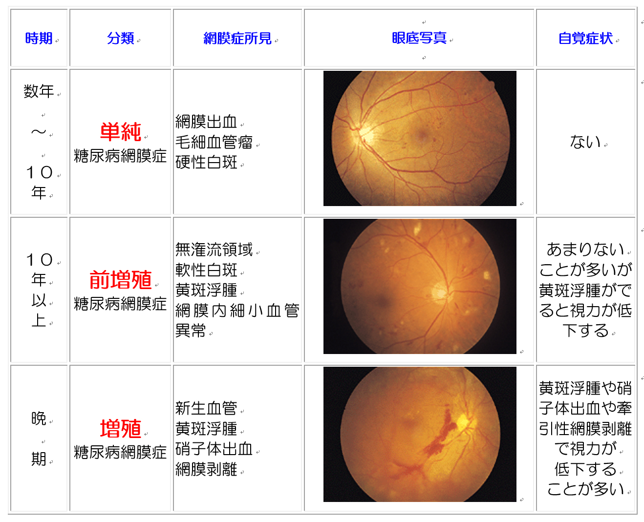 眼にはカメラのフィルムにあたる網膜という場所があります。網膜・腎臓は血管が豊富な場所です。糖尿病とは基本的に血管がつまる病気です。したがって、糖尿病が続く(糖尿病の罹患期間が長い)と網膜がいたんで(糖尿病網膜症が進行して)きます。
