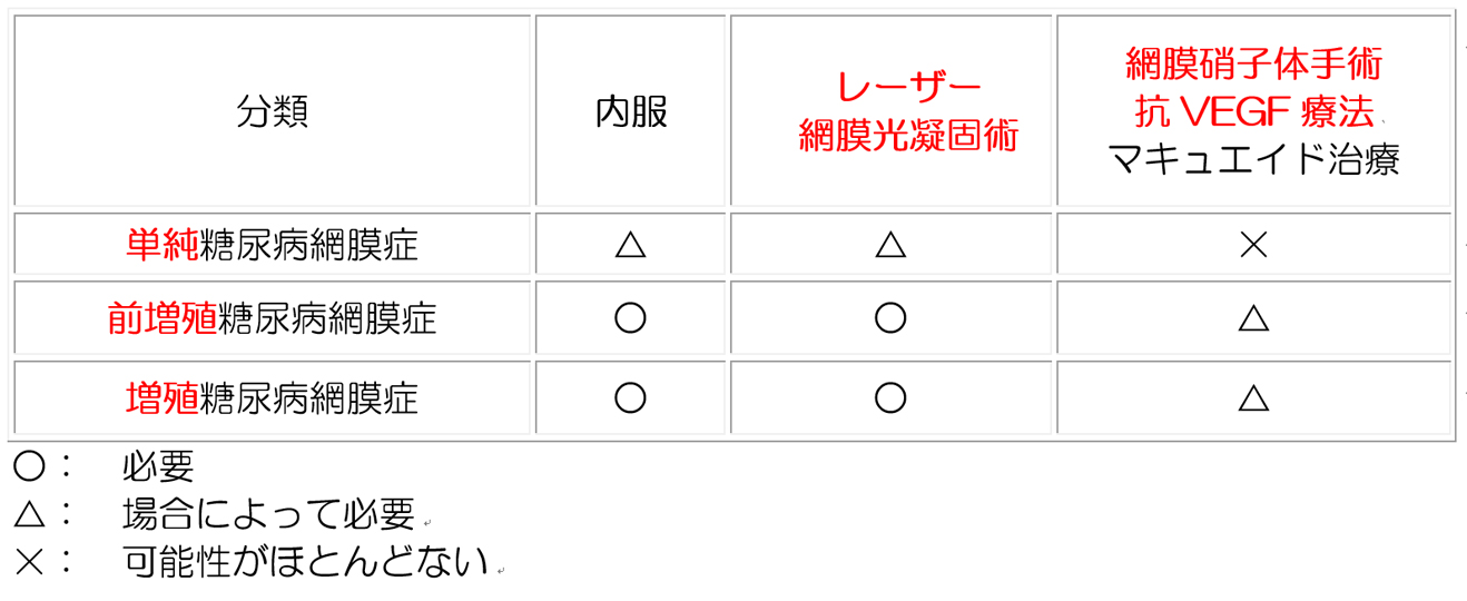 治療はそれぞれの網膜の状態によって変わります。表にしてまとめてみました。
