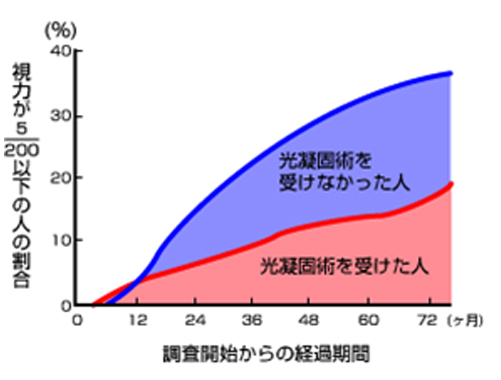 今見えている見えていないにかかわらず、糖尿病網膜症を抑える為に、すなわち網膜無血管野(虚血部分)の縮小・網膜新生血管の退縮・黄斑浮腫の改善・新生血管緑内障の予防治療・牽引性網膜剥離の予防のためには、網膜光凝固が必要となります。これにより新生血管が伸びてくるのを事前に防ぐことができます。網膜のいたんだ虚血部分へレーザー光を照射し、熱で凝固する手術です。この網膜光凝固術は、受ける時期が早いほど効果が高いといわれています。失明という最悪の事態の予防することを目的に、今日では積極的に行われています。網膜の状態により網膜光凝固は次のタイプに分けられます。